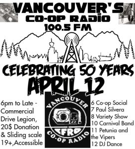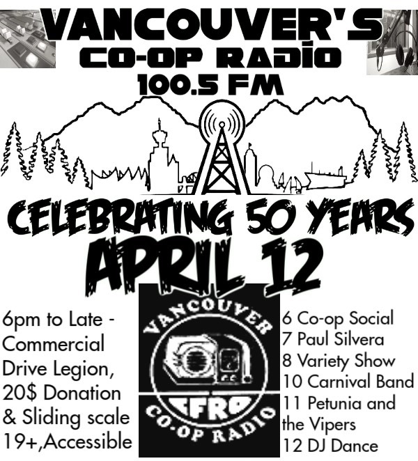 Celebration in Grandview Park with Britannia Arts & Culture team. Look for a bird on stilts, bannock, hyper-local and picked-that-morning salad, artmaking and plenty of other activities for adults and children. Also hyper-local vendors of art, craft and consumables. Congregating at the top corner of the park, we will play down to the stage for respectful focus on the indigenous speaker at 11:20.