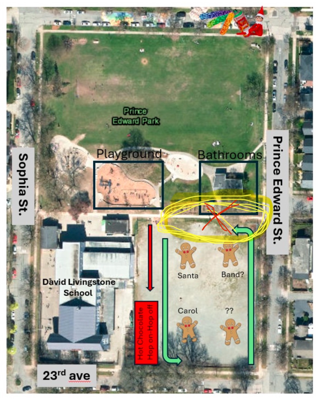 We will be riding around the gravel field on our brightly decorated bikes. I’m thinking the Carnie’s can play in the centre. I’m hoping everyone could dress festive! Elves, lotsand lots of lights :)